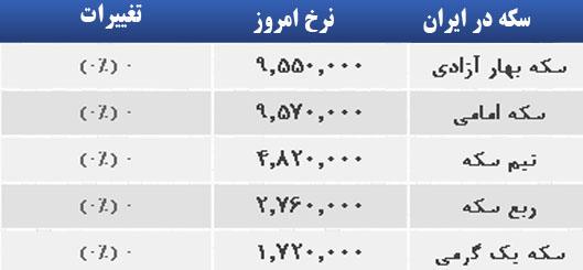 در آخرین معاملات بازار سکه و طلای تهران؛ هر قطعه سکه تمام ۹ میلیون و ۵۷۰ هزار ریال، نیم سکه ۴ میلیون و ۸۲۰ هزار ریال ،ربع سکه ۲ میلیون و ۷۶۰ هزار ریال و هر گرم طلای ۱۸ عیارهم ۹۷۷ هزار ریال قیمت گذاری شد .