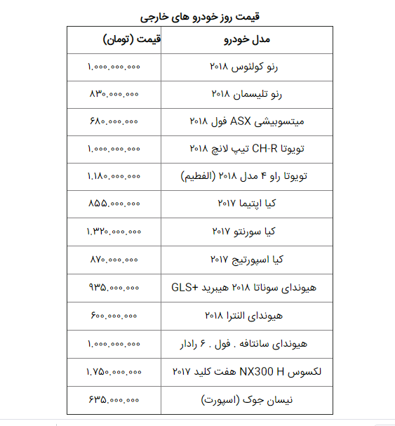 جدیدترین قیمت خودرو های وارداتی در بازار