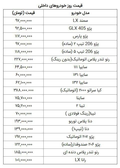 پژو پارس ۱۱۷ میلیون تومان، پژو ۲۰۶ تیپ ۵ (ساده) ۱۱۸ میلیون تومان، رنو تندر پلاس اتوماتیک (بدون رینگ) ۲۲۷ میلیون تومان، کیا سراتو ۲۰۰۰ (اتوماتیک) ۳۸۸ میلیون تومان، پژو ۲۰۶ صندوقدار (ساده) ۱۲۰ میلیون تومان و رنو تندر پلاس اتوماتیک ۱۸۵ میلیون تومان معامله شدند که این اعداد بیانگر کاهش ۲ میلیون تومانی است.