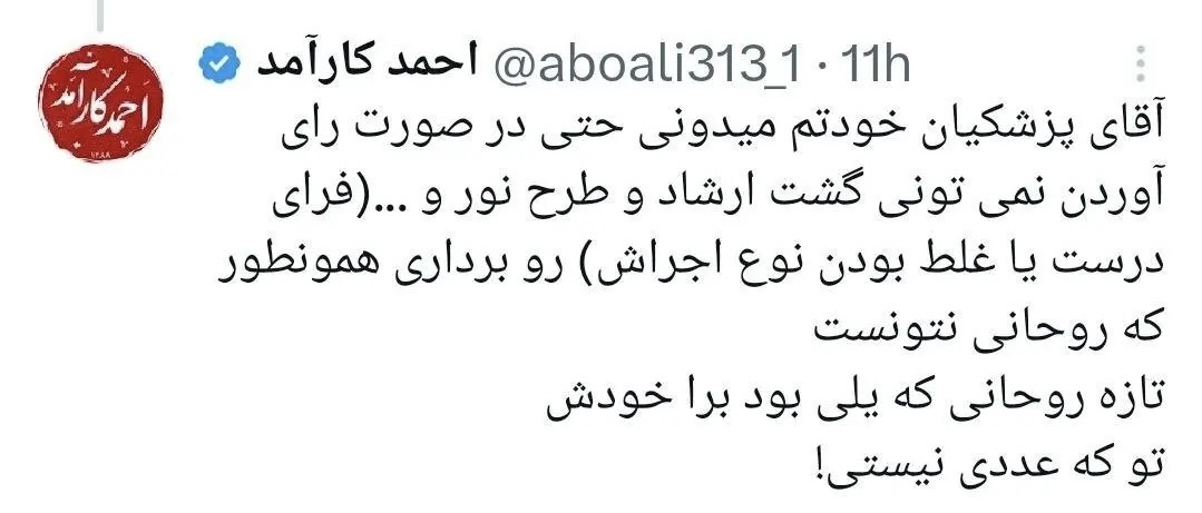 احمد کارآمد در واکنش به سخنان پزشکیان در شبکه اجتماعی ایکس نوشت:
