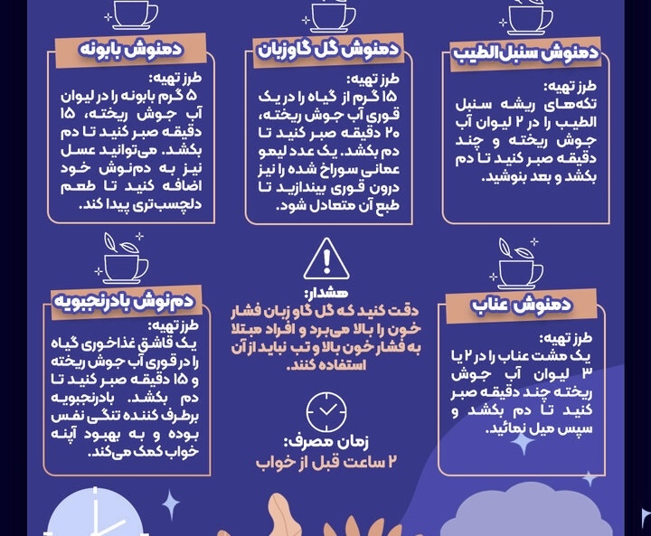 در این اینفوگرافیک به معرفی چند دمنوش موثر برای بهبود خواب شبانه و بررسی خواص آنها پرداخته شده است.