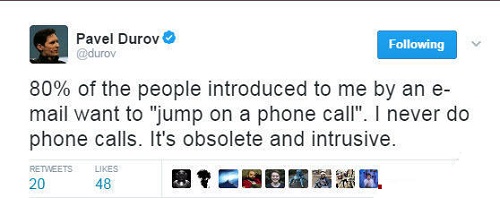 «۸۰ درصد مردم به من ایمیل می فرستند و از من درخواست می کنند که قابلیت تماس تلفنی را به تلگرام اضافه کنم، اما هرگز من این کار را انجام نمی دهم چرا که این کار منسوخ شده و دردسر ساز است.»